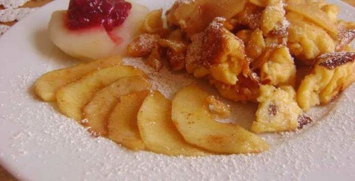 Fertiger Apfelschmarren mit Staubzucker (Puderzucker) bestreuen, dazu reicht man Vanillesoße.